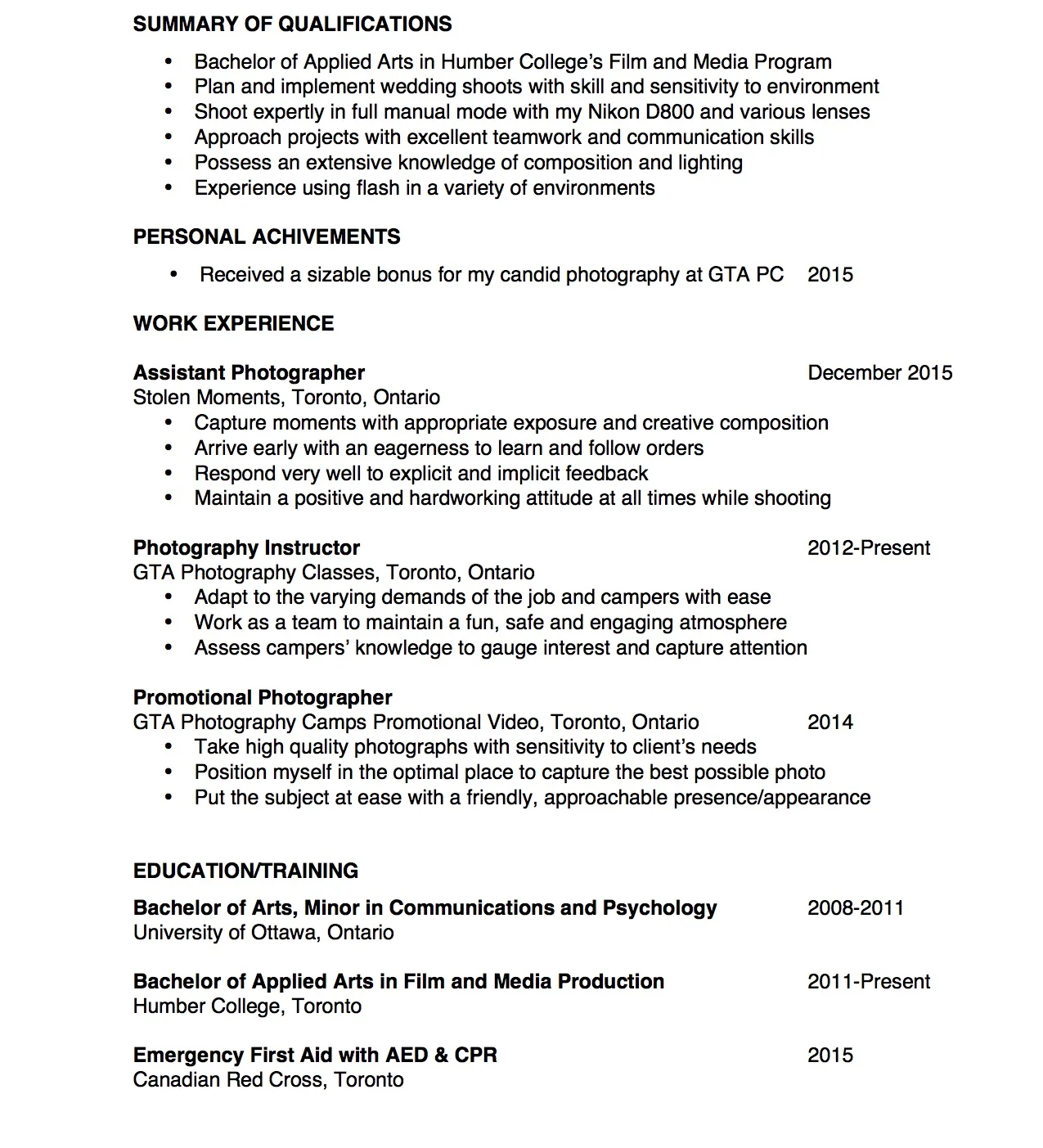 Assistant Photographer Resume Examples Assistant Photographers provide administrative and technical support to the photographer, either as trainees or apprentices participating in on-the-job training. As a photographer who is seeking a new job, you should double-check that your resume includes all relevant experience, as well as awards, specialties, software knowledge, and editing skills. Your education and the management, organizational, and other soft skills you have gained are important to mention in addition to showing your portfolio. A photographer resume example better than 9 out of 10 others. How to write a photography resume that gets more interviews. Tips and examples of