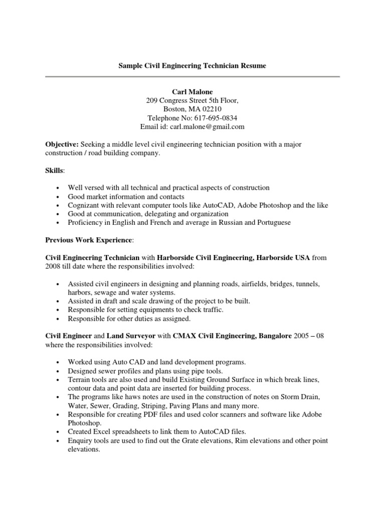 civil engineering work experience resume sample